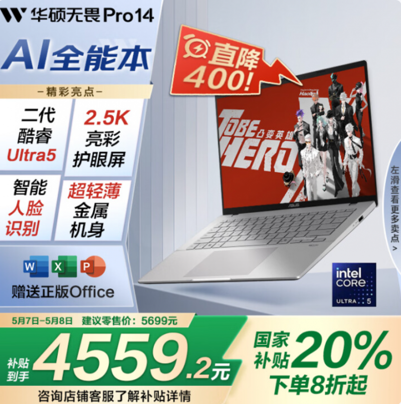 若是说好运取高颜值是幸运青出圈的环节,那华硕无畏Pro14 酷睿版 2025出圈靠的就是轻薄万能的适用性了,高能焦点共同高本质屏幕取全优设置装备摆设,可谓现代职场人士取学生党的必备智能帮手。现鄙人单即可享受至高2000元国补福利, 到手仅需4559元,极具选购价值。